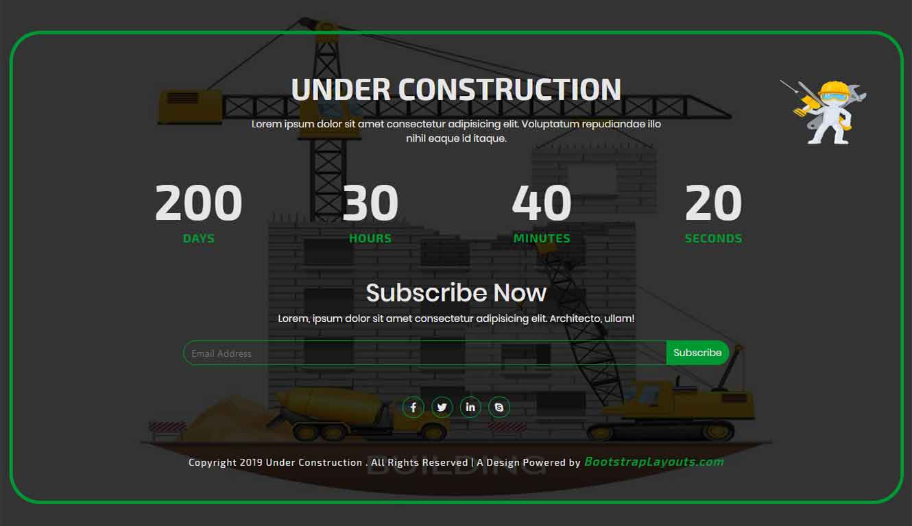 Exillo is a completely responsive Under Construction Landing Page. It is a ready to go template for anyone to use. It is completely flexible. It has a sence of under construction because of its background photo and you can change the background photo to any photo of your choice.